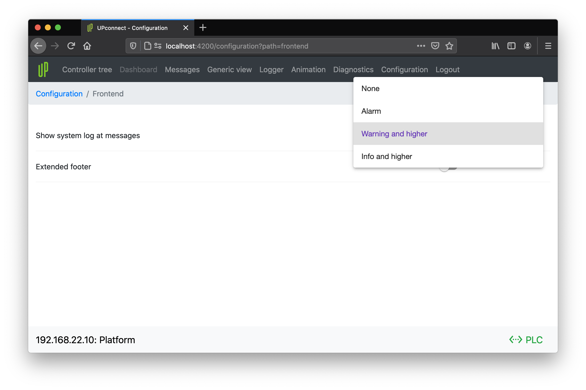 - Alarm (default): system log messages displayed at logger and at message view if level is alarm.