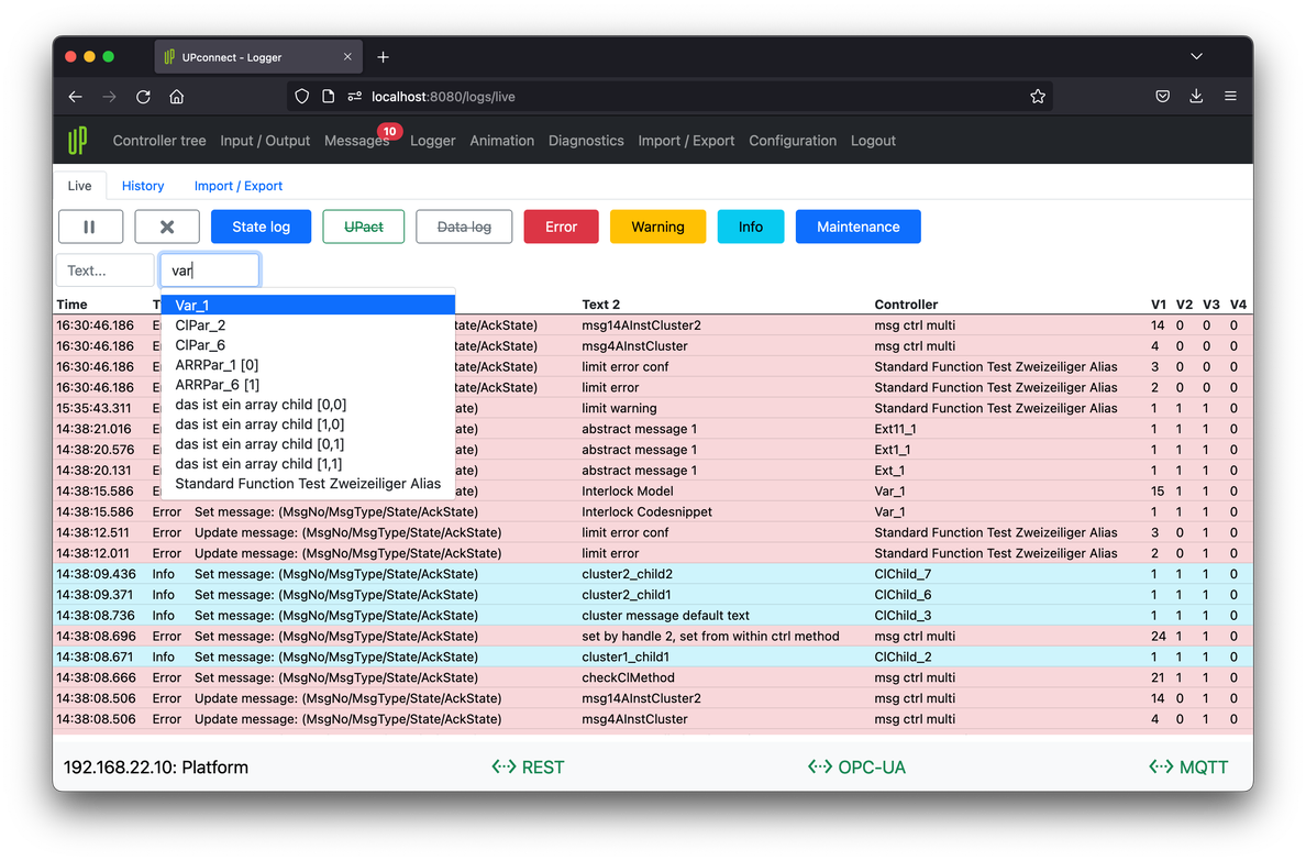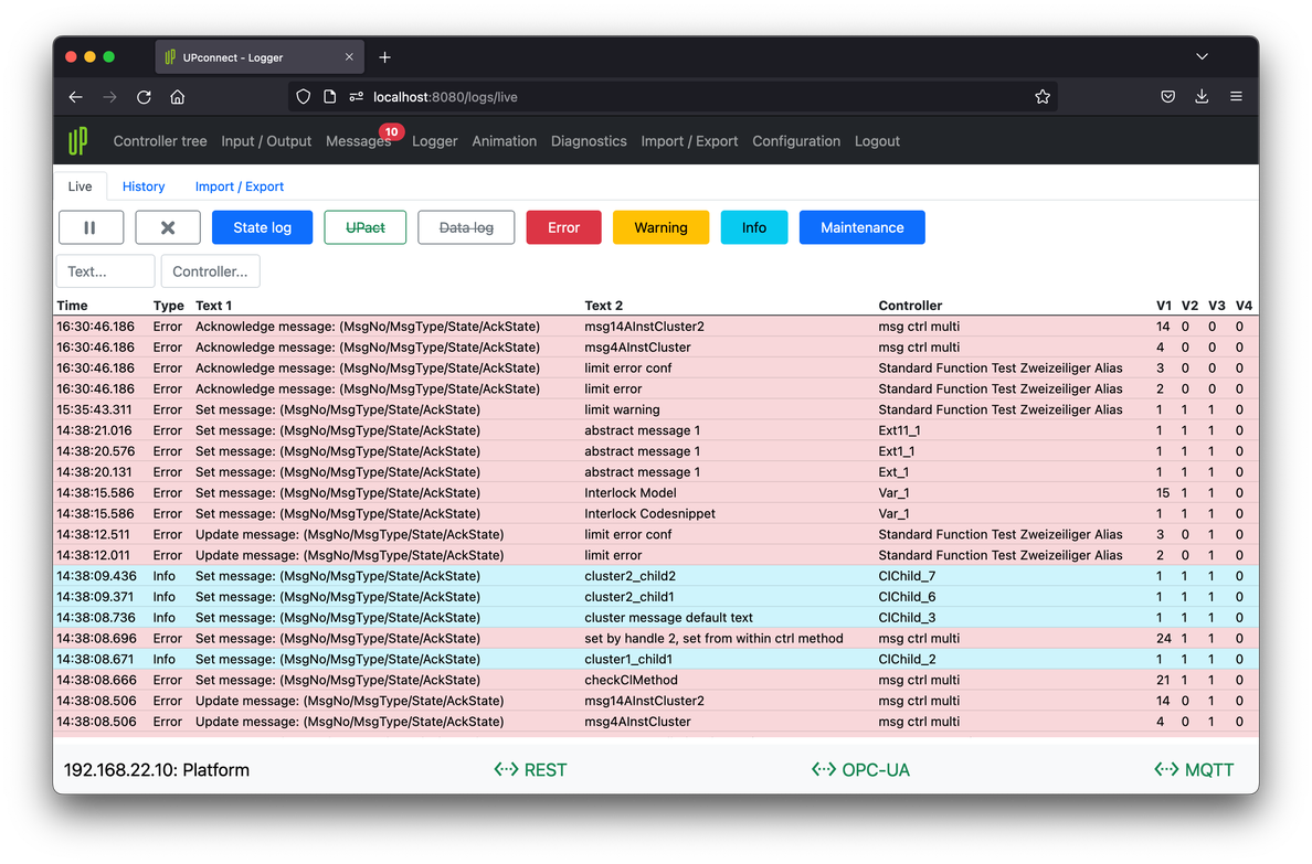 Use logger tab to analyze PLC behavior. Live logger tab shows actual entries received from connected PLC.