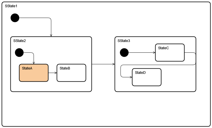 In the following figure, StateA is in a hierarchical relationship to SState2 and SState1. Since StateA is active, SState2 and SState1 are also active.