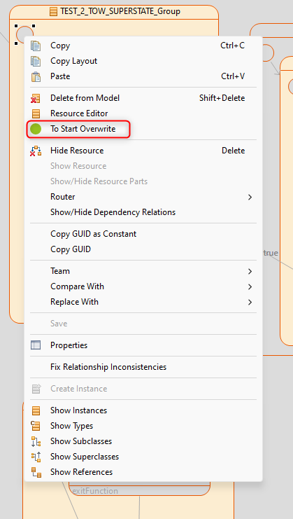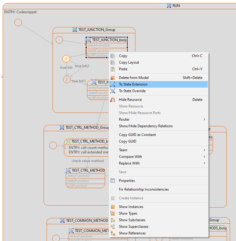 The state that is extended basically remains as it is. It can simply be extended by function or transitions. It is also possible to overwrite single functions or transitions. Further additional states and junctions can be created.