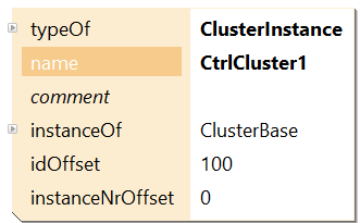 In the cluster instance properties, we can define the class of which we want to create an instance of. IdOffset lets us ensure that all ControllerInstances in our cluster have unique id's (the value of idOffset will be added to the id value entered into the instance in the cluster when generating the code). InstanceNrOffset has the same purpose, but for the instance number. When creating mutliple instances of the same cluster class, instanceNrOffset and idOffset need to have different values on every instance.