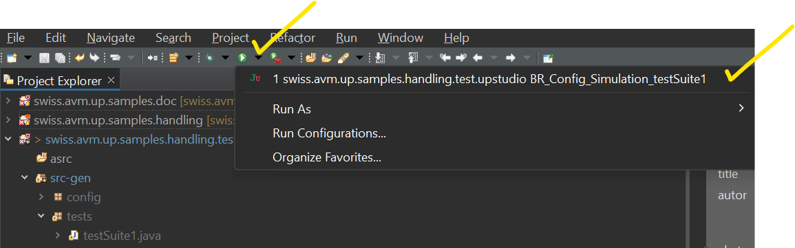 Import swiss.avm.up.samples.handling into the workspace. It is an UP sample project where controller and tests are already defined.